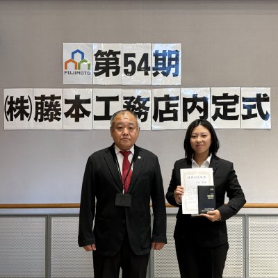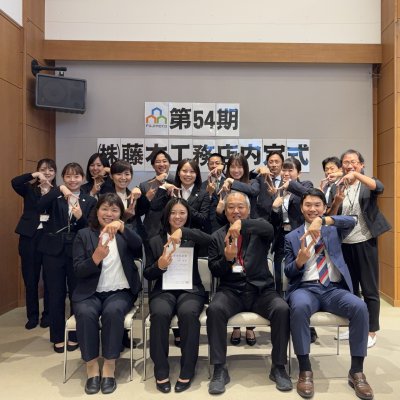 10/3(金)、内定式を行いました! 新しい仲間が加わることに、私たち社員もとてもワクワクしています☆ <内定者感想> 「内定式を終えて、先輩社員や幹部の方々の前で自分自身の意気込みを話したことで、これから藤本工務店の一員になるという責任と自覚を改めて実感しました。不安はありますが、まずは自分にできることを達成できるように取り組み、常に成長し続ける人材になれるように頑張りたいです。」 力強い言葉に、私たちも心が引き締まりました。 これから一緒に成長し、新しい未来をつくっていけるのがとても楽しみです^^