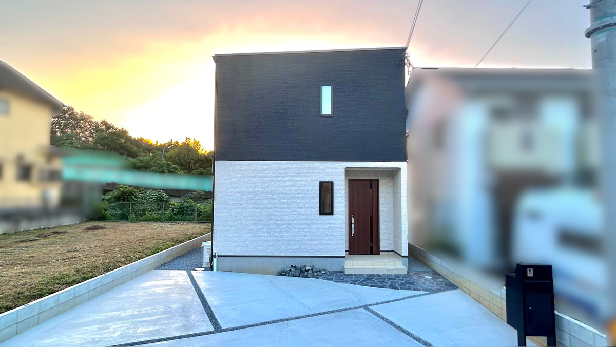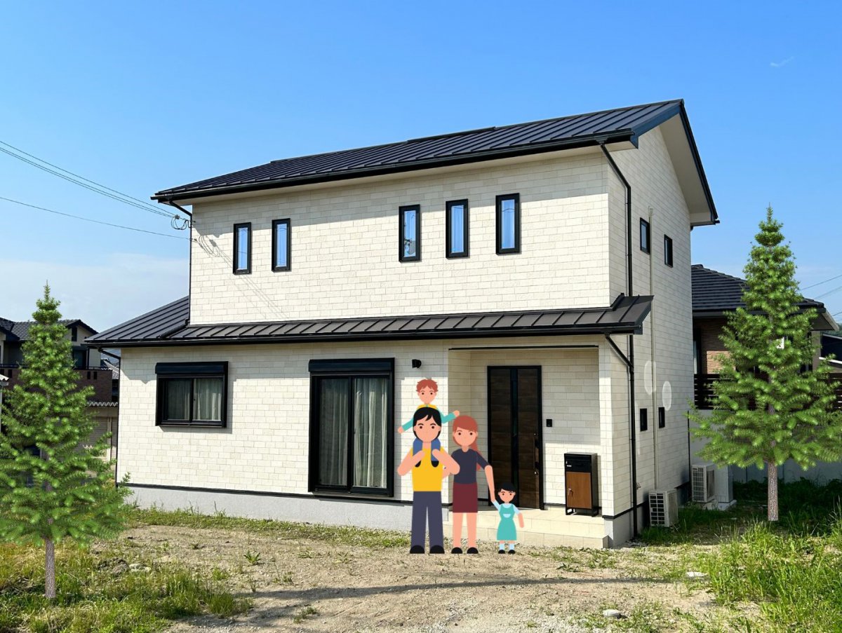 アクセントなしの屋根は切妻タイプのお家です。屋根は片流れだとコストをおさえることができますが、切妻は和風、洋風関係なく合わせることができます。画像のように白一色で切妻の屋根だとかわいらしい印象になります。こちらのお家は窓にもこだわりがありまして、外から見たときにおしゃれに見えるよう2階の窓はすべて縦滑り窓となっています。窓の位置や量など外観からの見た目も考えながら選んでみてください。