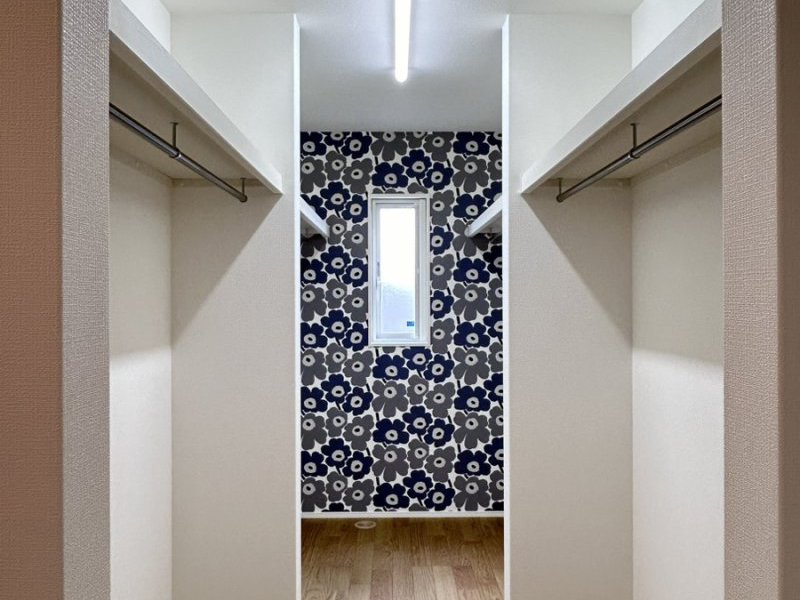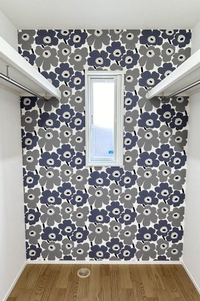 4帖設けたファミリークローゼットは奥様こだわりのマリメッコ柄をアクセントクロスとして使用しました。大来な柄でも一部分の使用であれば激しい印象を持たず、おしゃれな印象を与えることができます。4帖と広々としたウォークインクローゼットなので家族全員分の収納が可能となります。収納するものの量や大きさなども考えながら収納の大きさを決定すると良いと思います。