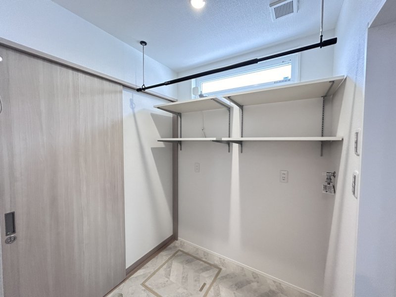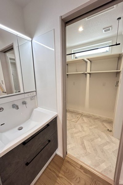 玄関入るとそのまま手洗いができる動線となっています。そしてその先にはランドリールームにもつながっています。なのでお子様がお家から帰ってきたら手を洗ってそのまま体操服などの洗濯物を出してLDKに入るという動線を確保されています。