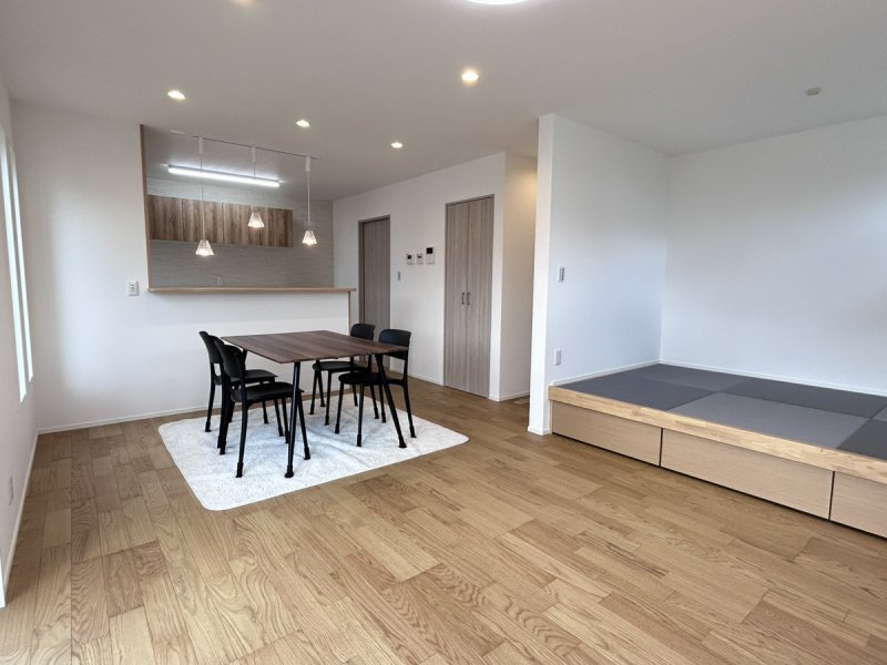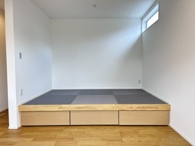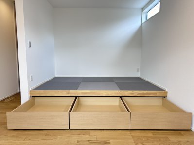 LDKとしては15.5畳となっていますが、プラスで小上がりの3畳の畳コーナーがあります。畳コーナーは黒の半畳畳を使用しています。小上がりになっているので部屋に立体感を出すことができます。そして小上がりになっているため下には収納を設けることができました。引き出し部分は1.5畳分、こちらの奥も収納になっています。おもちゃなどをしまっておくことができます。畳コーナーの部分が少しリビングに出っ張っていて、その分リビングは狭くなっていますが、全く気になりません。限られた空間に全部詰め込むための秘策となっています。