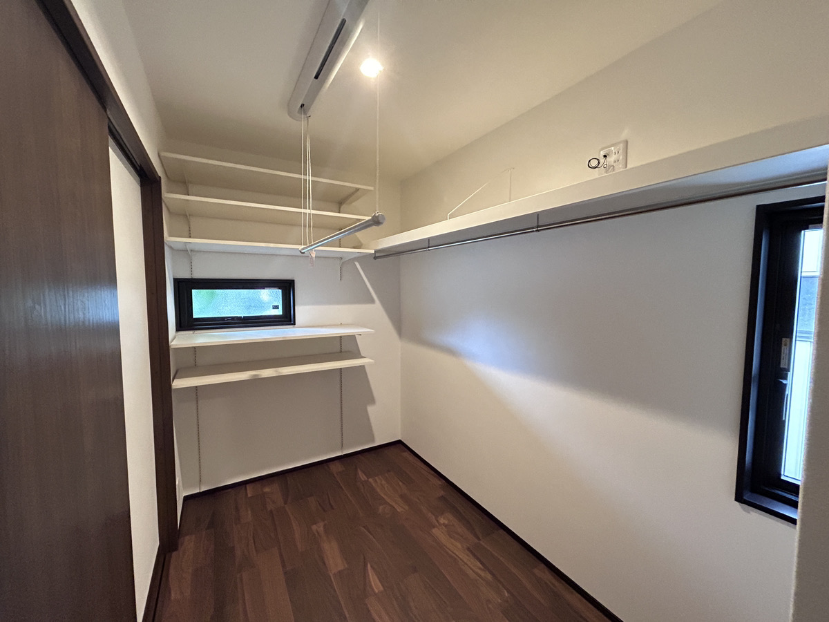 洗面脱衣室の横にはランドリールームを設置しています。干しヒメ様を設置することで、洗濯物をたくさん干すことも可能ですし、ハンガーパイプや収納をすることを考え可動棚も○段設置しています。ここで干してそのまま収納すると言うことが叶う間取りとなっていますので家事が楽になるお家の間取りです。