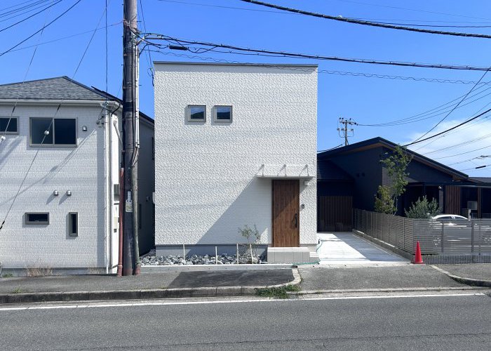外観は白で統一されており、シンプルながらも美しいデザインが特徴です。白い外壁に赤色のポストをアクセントとして設置することで、赤色が一際映えるデザインとなっています。外観や外壁がシンプルであっても、植栽を配置することで低コストでありながら高級感を演出することができます。価格をできるだけ抑えつつ、映えるお家作りをお考えの方には植栽の導入をおすすめします。