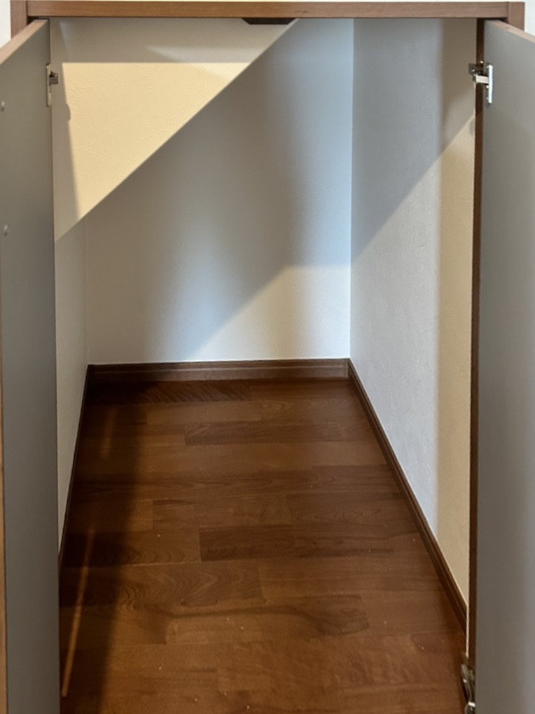 階段下の収納は、単なる収納スペースとしてだけでなく、ペットの遊び場やお子様の遊び道具収納としても利用できます。また、高さが十分にある場合には、トイレとしての利用も可能です。このように、無駄スペースをできるだけなくしたい方にぴったりの設計です。