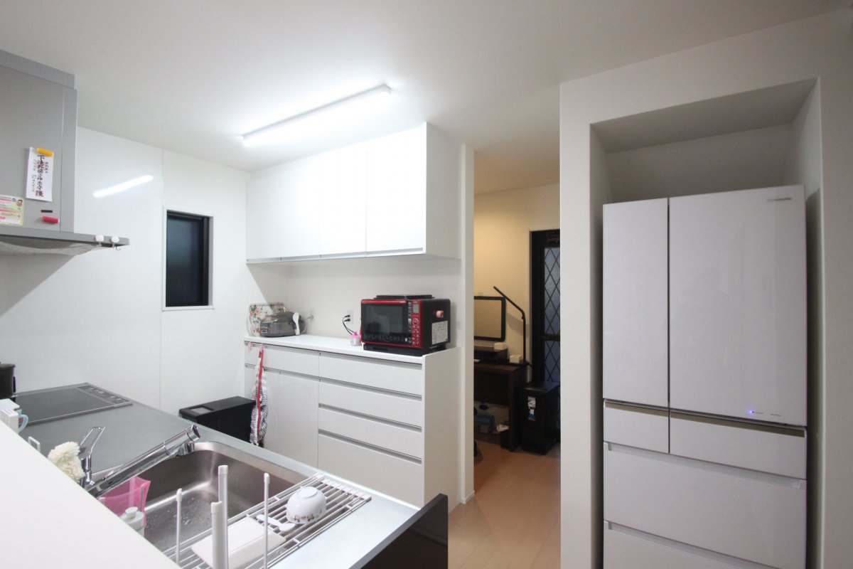 また、冷蔵庫はみんなが取り出しやすい位置に配置して冷蔵庫からリビングまでの距離を短縮。普段のたった少しの時間でも生涯を過ごす住まいだからこそ考えられて設計された家事ラク導線の一つです。 -