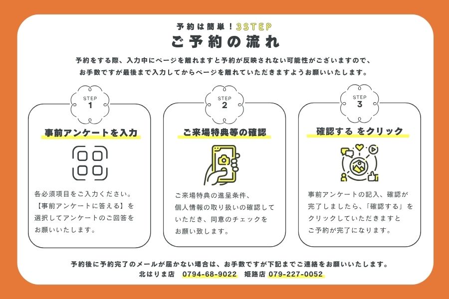 ・当日のご来場、及び夜間における翌日のご来場については、WEB上では予約受付をしておりません。 当日にご来場される場合は、お電話でのご予約をお願い致します。 ・イベントのご予約状況により、ご希望に添えない場合がございます。 ご来場日時の変更につきまして、担当者よりご連絡させて頂きますので、ご了承下さい。
